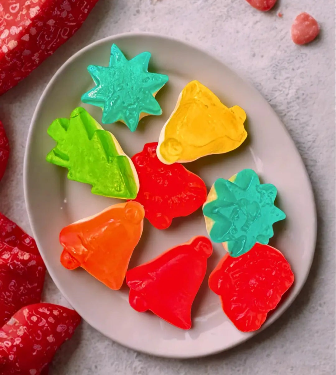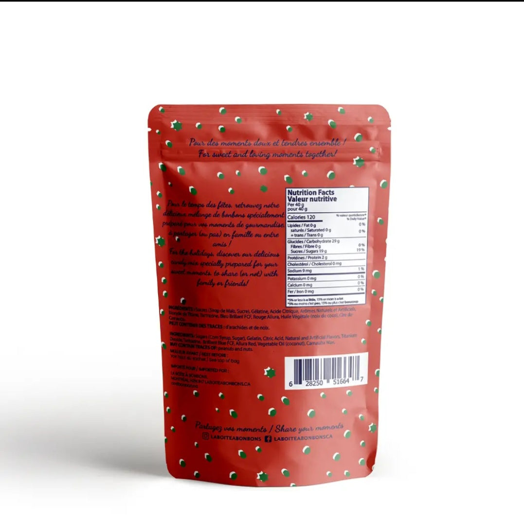 A delicious mix of gummies in the colors of Christmas!  Red & green xmas trees and little white snowmen can be enjoyed watching xmas movies by the fire with a hot chocolate in one hand, and gummies in the other:)  Shareable - or not!